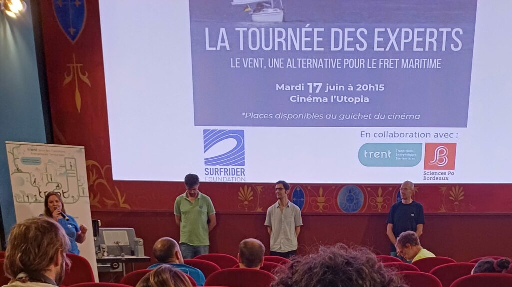 A l’initiative de l’association Surfrider Fondation, et aux côtés du chercheur Sylvain Roche et de Marc Thienpont le DG de Beyond-the-sea, la société d’Yves Parlier, j’ai participé à cette soirée consacrée aux dégâts environnementaux et sociaux du Fret maritime international. Nous y défendions le transport vélique et d’autres modèles sociaux. J’y représentais la coopérative Windcoop qui construit le premier porte containeur à voile.